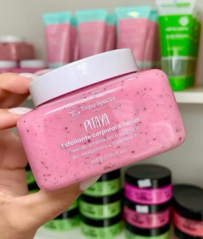 Descubra o Esfoliante Corpo e Rosto - Pitaya - Toque Especial, a solução perfeita para uma pele renovada e saudável! Com 200g de pura potência, sua fórmula é enriquecida com óleo de amêndoas, girassol, ácido hialurônico e vitamina E, proporcionando uma esfoliação suave que elimina células mortas e promove a hidratação profunda.
