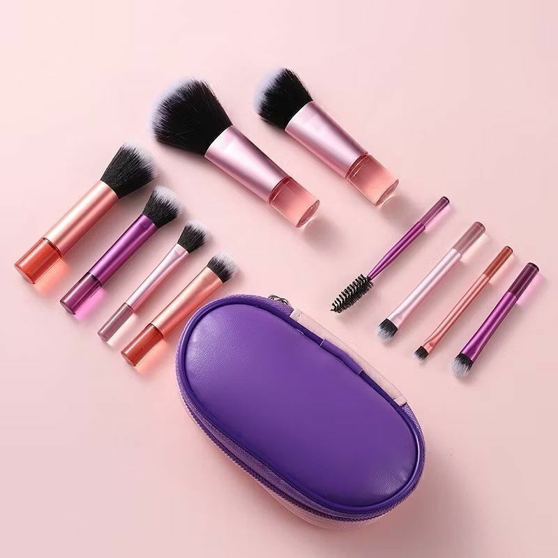 10 pincéis de maquiagem portátil de alça curta multicolor com kit de armazenamento, incluindo pincel de blush, pó solto, escova de sombra, pincel de cílios, escova de sobrancelha e pincel de manchas.